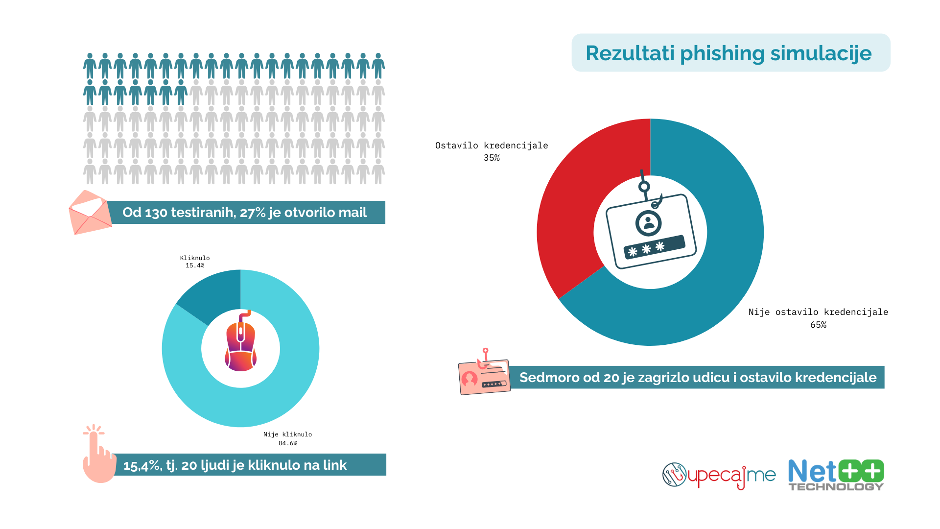 Na testu koji je Net++ technology sproveo 2018, kao deo demonstracije „Upecaj me“ servisa, pokazalo se da je 27% testiranih otvorilo email, 15% njih je kliknulo na link, a 5% je ostavilo kredencijale na phishing sajtu kreiranom za namenu testiranja. Pri tom, važno je napomenuti da su u našoj simulaciji učestvovali IT stručnjaci, štaviše zaposleni u security sektoru, što govori da svako može postati žrtva phishinga.